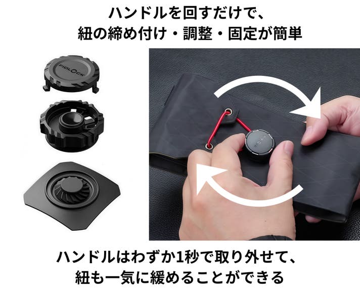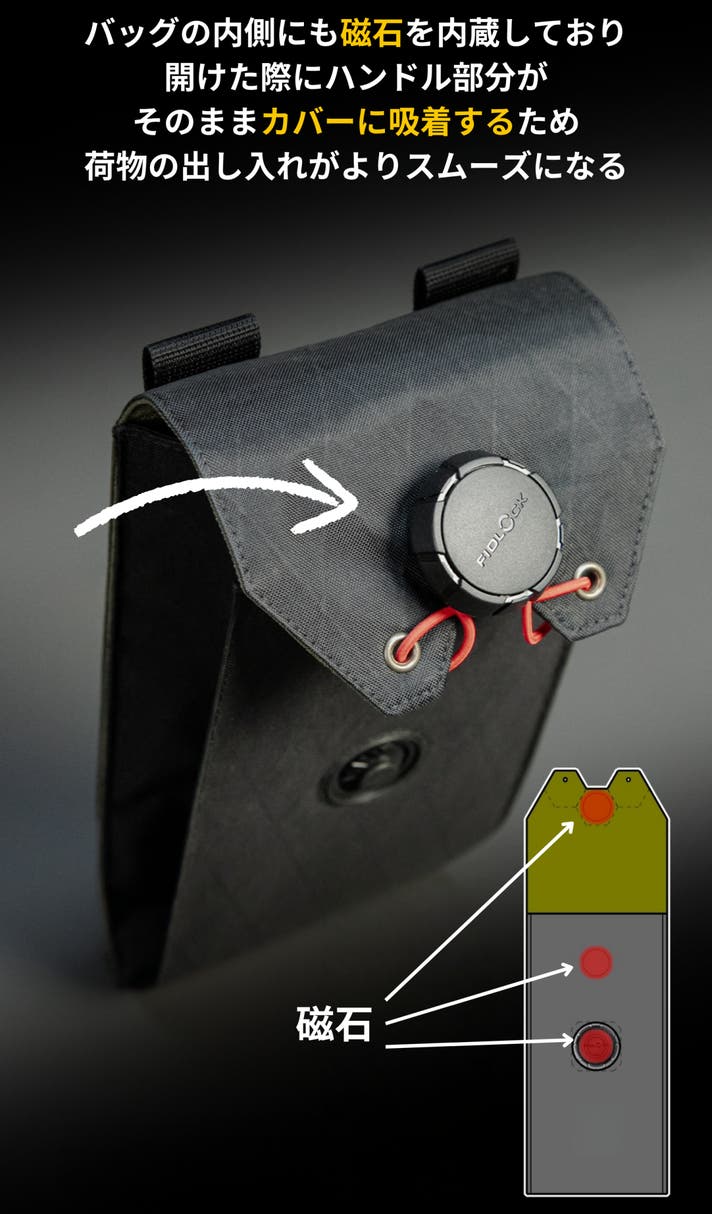 FIDLOCK WINCHは磁力により吸着するだけでなく、回転も可能なため、ハンドル内部にあるゴム紐とともにスムーズな巻き取り動作を実現します。