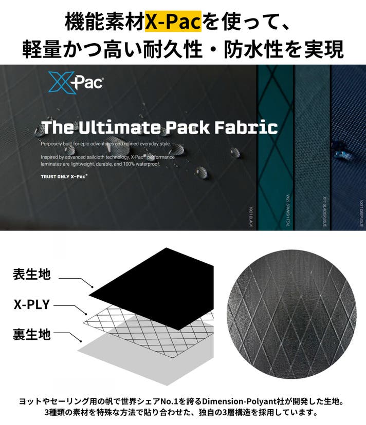 軽量かつ耐久性・防水性に優れた「X-PAC素材」を採用。アウトドアから日常使いまで幅広いシーンで長く愛用でき、見た目もスマートで洗練された印象を持たせています。