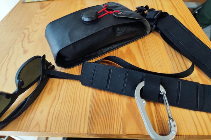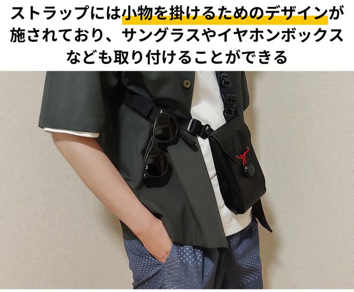 A:ストラップ部分には小物を引っ掛けるデザインが施されているので、サングラス、イヤホンケース、キーリングなどを簡単に取り付けられます。
