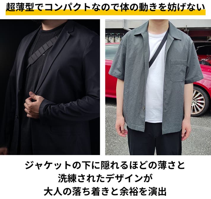 A:ジャケットの下に隠れるほどの薄型設計ながら、財布、スマートフォン、パスポート、キーケースなど必要なアイテムがしっかり収納できます。