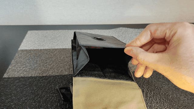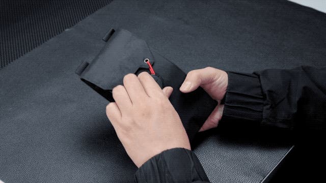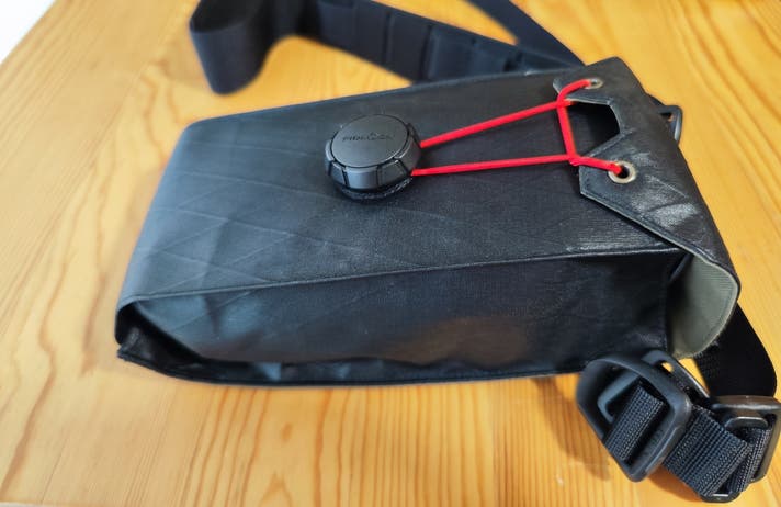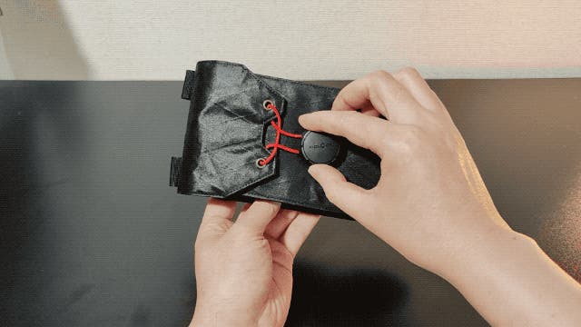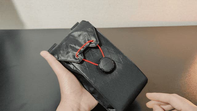 また、少量のものを入れる時は、FIDLOCK WINCHの回転操作を使わなくても、上部のゴム紐をハンドルに掛けるだけでバッグの締めが完了します。