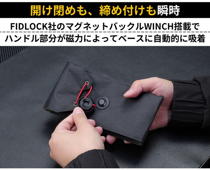 ドイツのFIDLOCK社製マグネットバックル「WINCH」を採用しており、ハンドルを回すだけで紐の締め付けが簡単にできるため、バッグの中身に合わせて自由に容量を調節可能です。