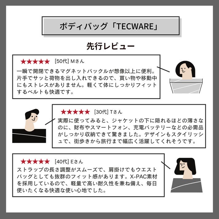 そんな日常的な不便さを解消し、「もっと快適に持ち歩きたい」という想いから、今回ボディバッグTECWAREのプロジェクトを立ち上げました。