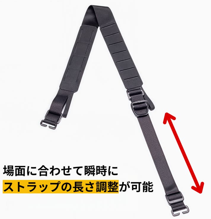 A:はい、瞬時に長さを調整でき、体型や服装、用途に合わせて最適なフィット感に調節可能です。ストラップの長さは81cmから105cmまで調整できます。