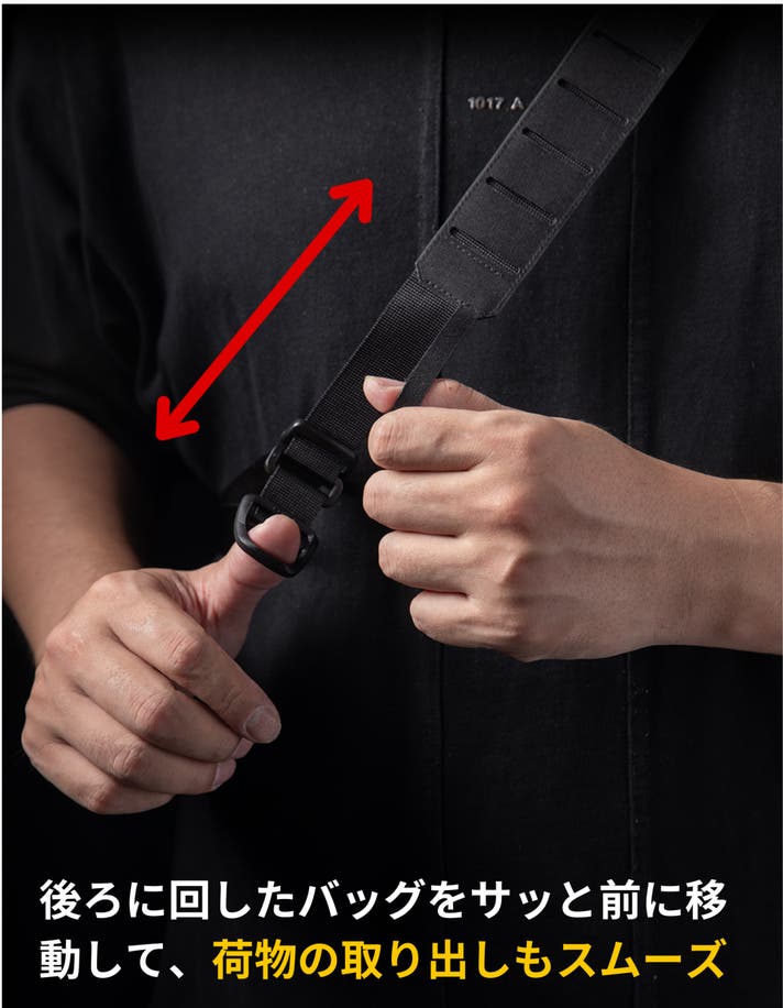 ストラップは瞬時に長さを調整でき、肩掛けや斜め掛けなどシーンに合わせた持ち方が可能。急に荷物を取り出したいときも、背中からサッと前に持ってくることができ、使い勝手抜群です。