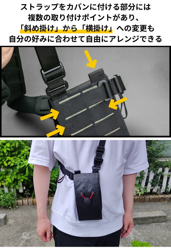 ボディバッグ「TECWARE」の背面には、複数のストラップを取り付けられる箇所が設けられています。