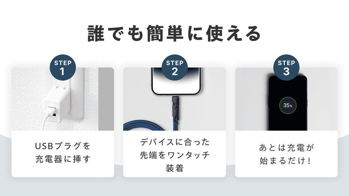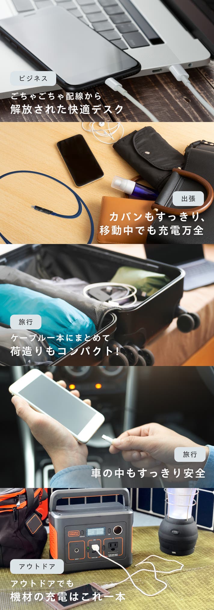 これ1つさえあればビジネスから旅行中の充電まで利用できる、マルチな充電ケーブルです。