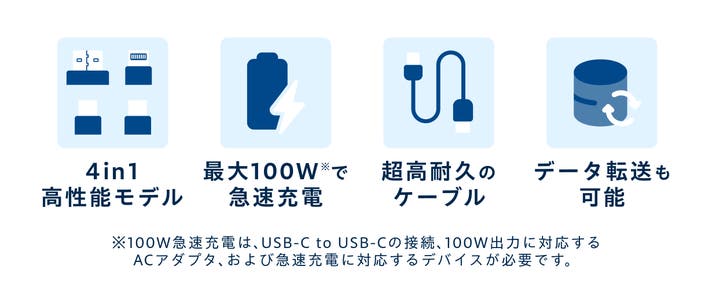 ※100W急速充電は、USB-C to USB-Cの接続、100W出力に対応するACアダプタ、および急速充電に対応するデバイスが必要です。