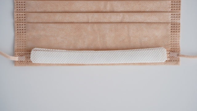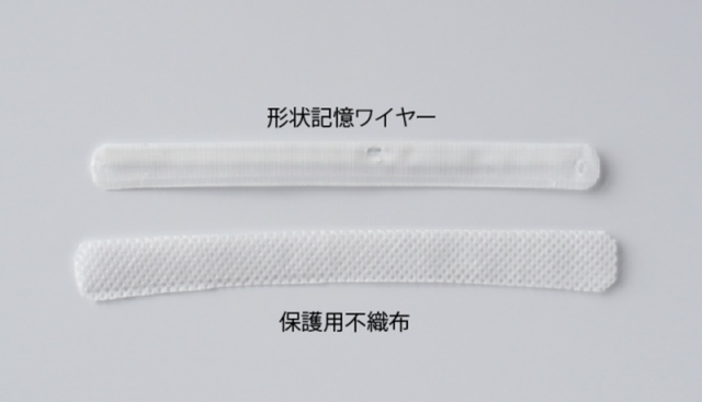 両面とも面ファスナーのフックの中に形状記憶ワイヤーが入っており、不織布マスクの下の内側には貼って湾曲させて貼って空間を作ります。