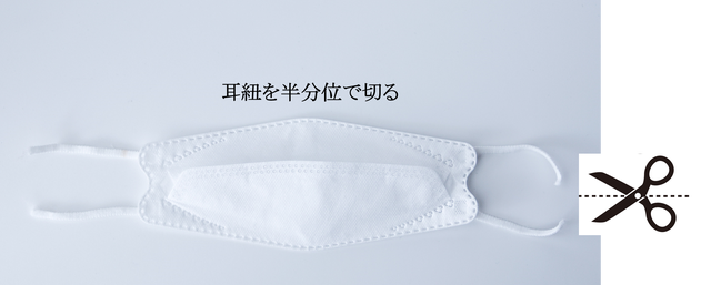 ① お手持ちの不織布マスクの左右の耳紐を半分の位置で切ります。