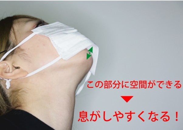 耳紐を延長して緩めた状態で、内側の下に形状記憶ワイヤー(マスクプラスバー)を貼るとアゴとの間に空間を確保できマスクが離れるので、外気が直接吸えて息が戻らず、断然息が楽になります。お化粧が付きにくいなどの効果があります。