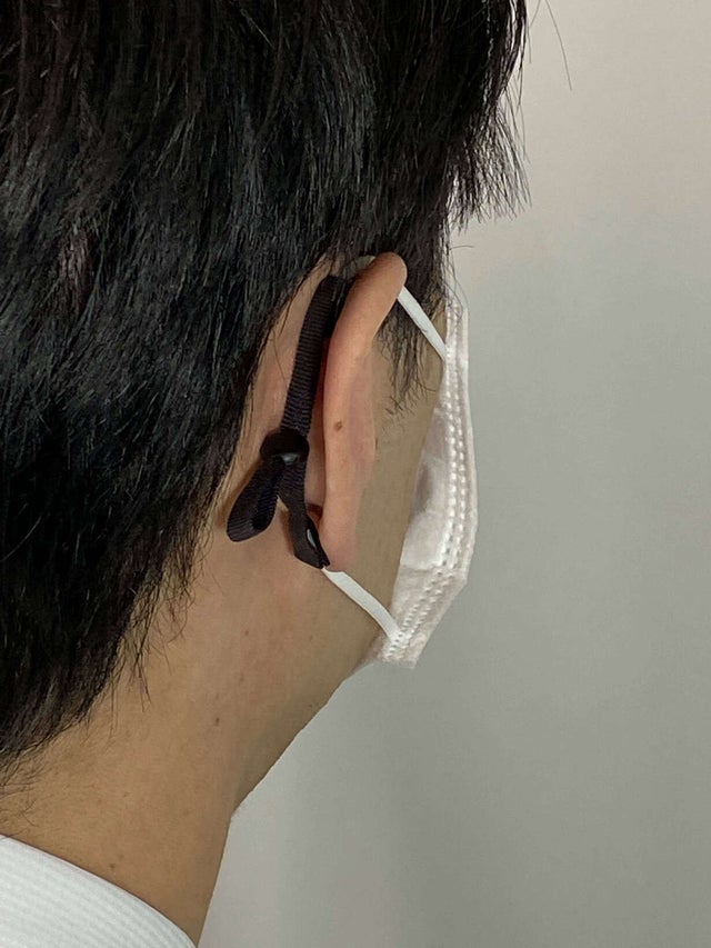 大阪大学名誉教授で福井工業大学の宮本裕司教授との共同開発・国内特許出願済の不織布マスクの耳紐延長アタッチメントです。切った不織布マスクの耳紐と極薄の面ファスナーがくっつく特性を利用して挟み込み、装着。 「紐を延ばす」という斬新なアイデアで、「マスクを着けていると耳が痛くなる」「息苦しい」というお悩みを軽減します。