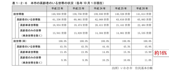 上の表を見ていただくとわかるように65歳以上の一人暮らしは いわき市全世帯の16%近くになります。これは6~7世帯に1世帯は高齢者の一人暮らしを表します。