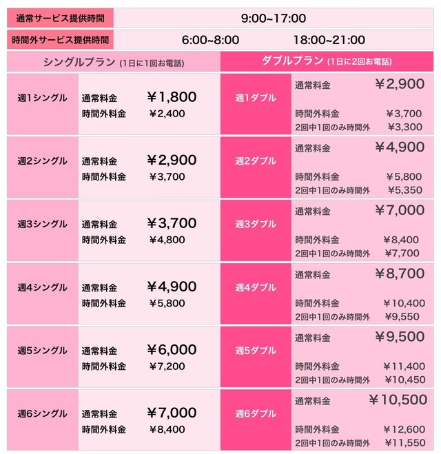 また、午前9時~午後5時までの通常時間内のサービスの他に午前6時~8時、午後6時~9時までの時間外サービスも対応しています。※それ以外の時間はご相談ください