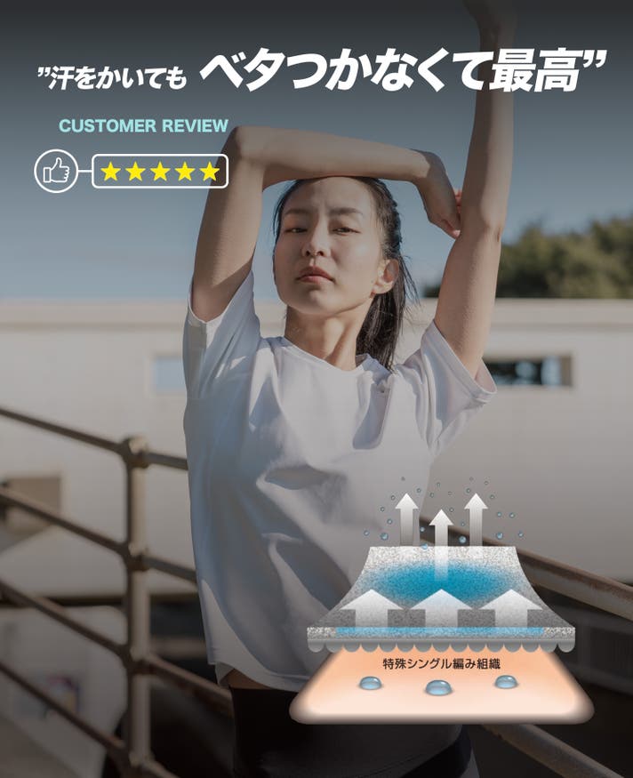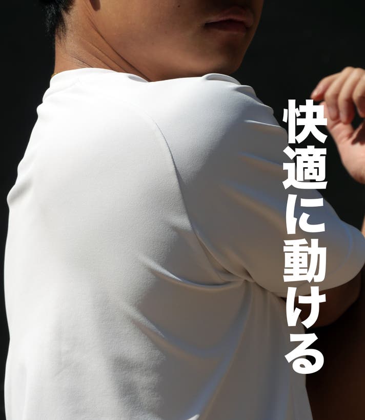 「MOON-TECH®」は、特殊構造による優れた「汗処理」性能を備えており、ムレやベタつきを軽減します。猛暑の中での運動で大量に汗をかいても、ベタつきにくく、通気性に優れたなめらかな素材感で、さらさらとした心地よい肌触りをキープします。特に、アクティブな動きや運動時でも、ベタつきによる突っ張りで動作の可動域が制限されることはありません。