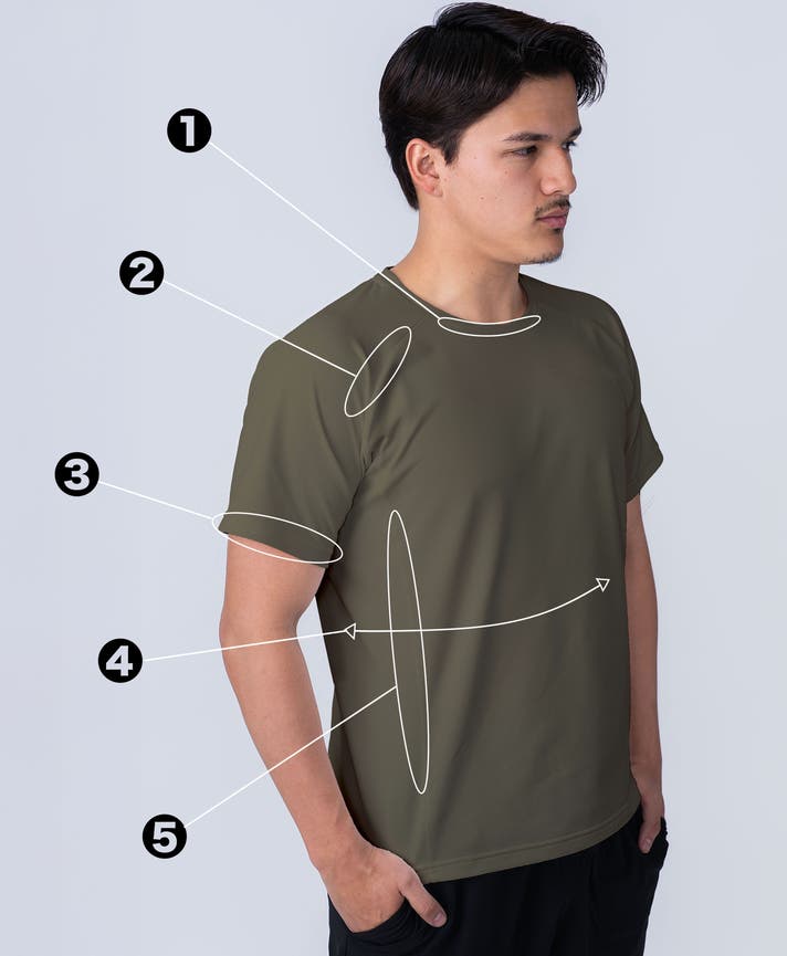 ※ 通常のTシャツは脇下から裾にかけて真横に縫製ラインが入りますが、TENEZではそのラインをやや前方に設計しています。