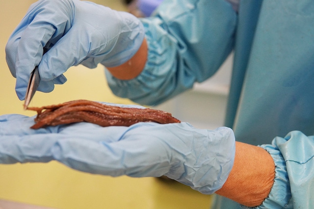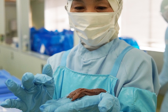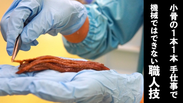 1年後にイワシとの再会。優しくスポンジで皮を剥いた後に、ピンセットで中骨を取り除き、三枚におろします。絹糸より細かい小骨も見逃さない。この精密さと手早さは、熟練作業者の腕の見せどころ。国産アンチョビーのおいしさを支えるのは、世界に誇る匠の技なのです。
