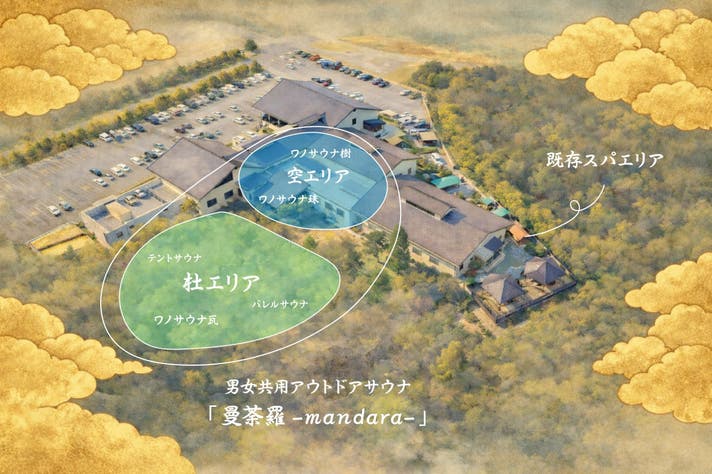 新エリアは、男女共用アウトドアサウナ「曼荼羅 -mandara-」と名付け、大きく「杜 -mori-」と「空 -sora-」にエリアを分けて花鳥風月をご堪能いただける仕様となっています。