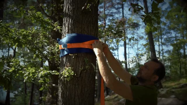 ストラップを幹に巻き、ラチェットへ接続。フロアが“フラット寄り”になるようテンションを調整する。