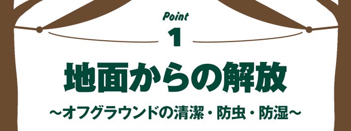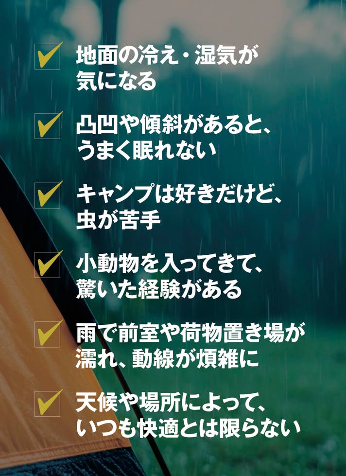 地面から離れることで冷たく濡れた床から身を守り、凸凹や傾斜による不快感も解消。小動物や虫の侵入も防ぎ、快適な睡眠環境を実現します。