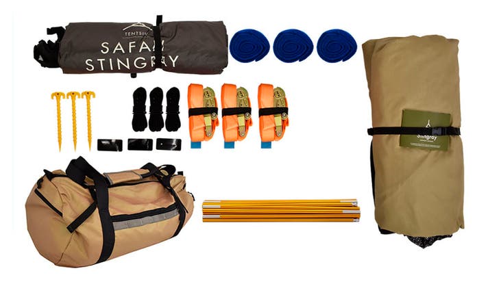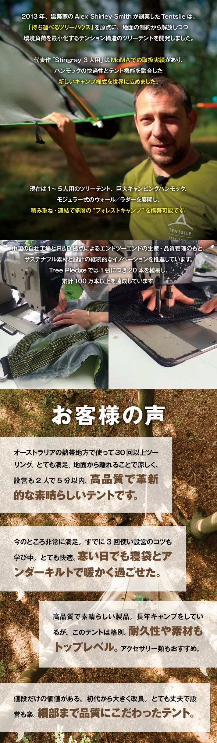 今回は、イギリスのアウトドアブランドTENTSILE社のSafari Stingray 3-Person Tree Tent(本体)と、季節対応を高める公式アクセサリー3点(インサレーションクイルト・トラペジウムウォール・ウェビングラダー)をセットでご案内します。