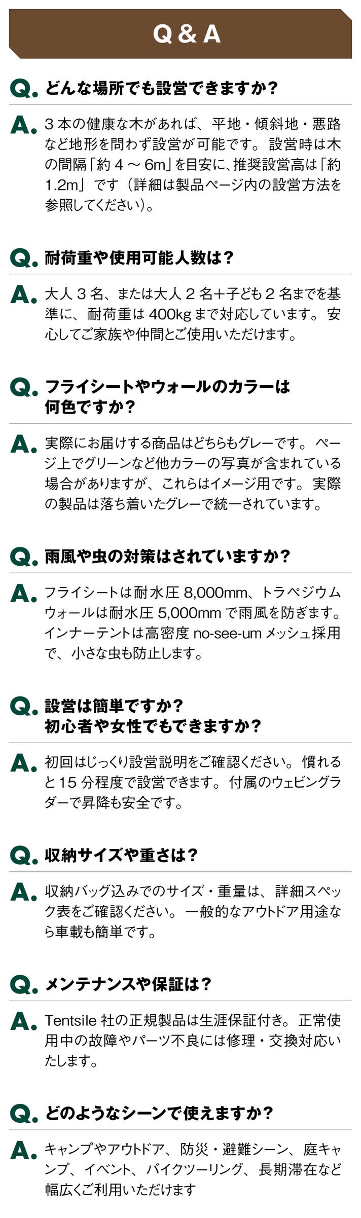 お届けする商品には、すべてTentsile社の「製品保証」が付いており、利用規約及びオーナーズマニュアルに従って使用されている限り、全ての製造上の欠陥に対してメーカー保証が適用されます。