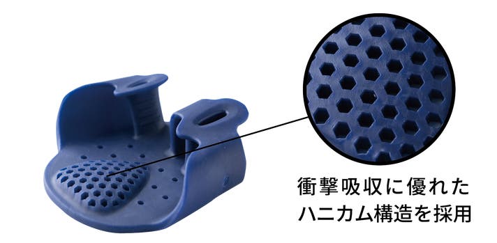 底面をハニカム構造にすることで、足にかかる衝撃を吸収。材質、形状から足をしっかりサポートします。