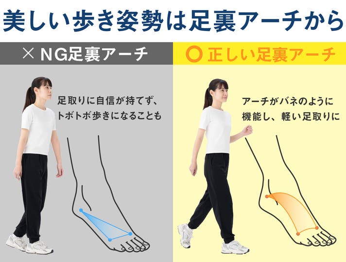 さらに、足裏アーチがカラダにかかる負担をバネのように吸収し、踏ん張る力が発揮されます。