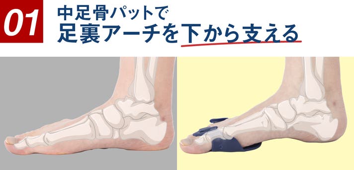 - 中足骨を支えて足裏の横アーチ、内側縦アーチ、外側縦アーチの3点アーチを持ち上げるようにサポート