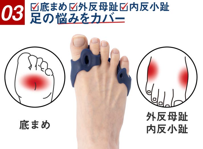 底まめ・外反母趾・内反小趾の足の三大悩みのお悩みをフルカバー。よく伸びるシリコンがお悩み箇所を優しく包み込みます。