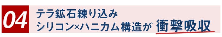 テラメタは、中足骨(ちゅうそっこつ)部分を下から支えて足裏アーチをサポートし、美しい姿勢、歩き方をアシスト。テラ鉱石が練り込まれたシリコンが歩行時の衝撃から足を守ります。