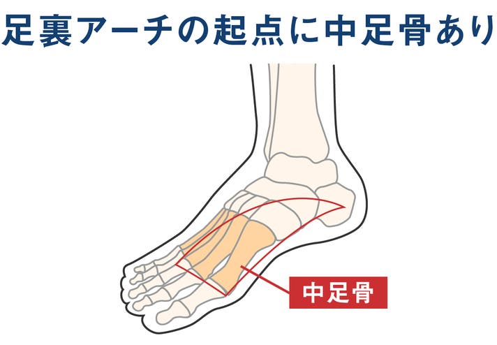 など、歩く・走る動作において重要な役割があります。また、足裏アーチを保つための役割も担っており、足裏アーチが衰えると、この中足骨がペタンコに広がってしまいます。