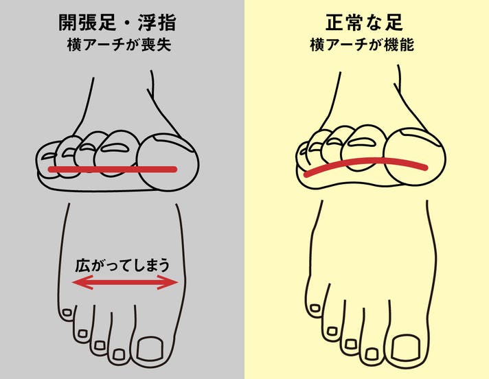 横アーチが衰えている足は開帳足といわれ、中足骨がペタンコに広がってしまい、足指の付け根に負担がかかります。