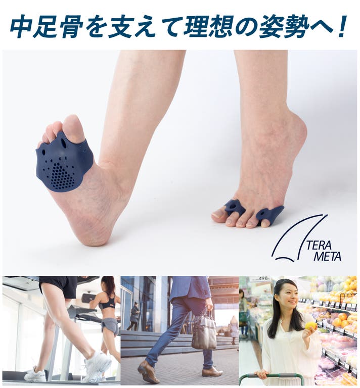 テラメタは中足骨を下から支え、足裏アーチを物理的にサポート。横アーチ、内側縦アーチ、外側縦アーチの足裏3点アーチをサポートすることで理想的な姿勢へ。