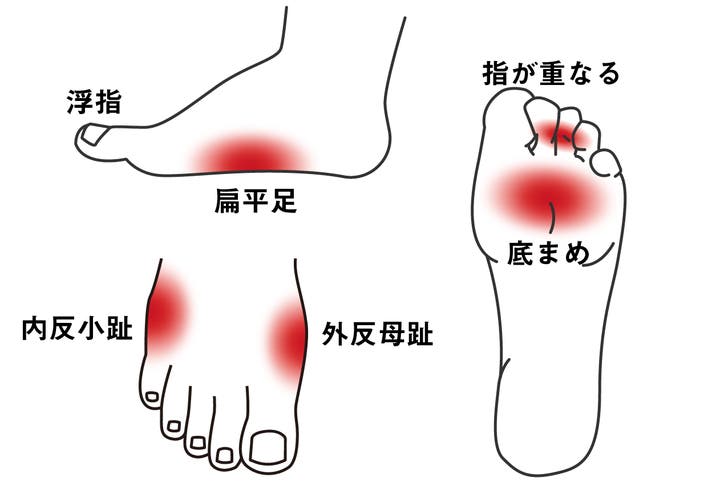 足指の付け根への圧力が増大することで、痛みを感じることが多く、皮膚が硬くなって厚みを増す足裏の底まめや、親指・小指の付け根に違和感を感じて悩む方も多くいらっしゃいます。