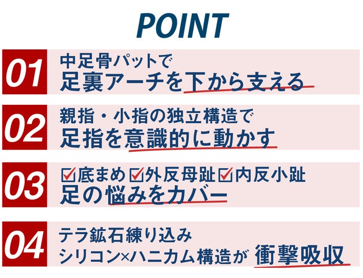 さらに、足の機能を最大限に活かすための足指トレーニングも同時に行うことが出来ます。また、反発力のあるシリコンが、足の三大悩みといわれる底まめ・外反母趾・内反小趾で悩む部分をカバーながら、地面からの衝撃を吸収し、歩行全体をサポートします。