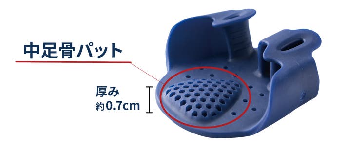 約0.7cmの中足骨パットが、中足骨部分を下から持ち上げるように支えることで、横アーチ、内側縦アーチ、外側縦アーチの足裏3点アーチをサポートします。