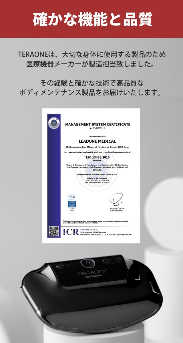 TERAONEは、本国韓国代表のナショナルチームのアスリートをサポートするプロのトレーナーチームがその経験を活かし企画し、医療機器メーカーが製造担当した確かな品質の多機能ボディメンテナンス製品です。
