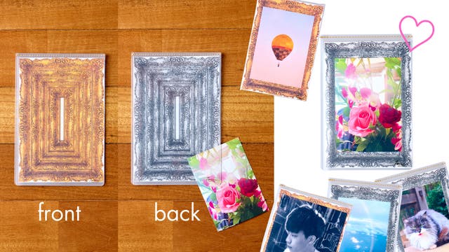 ゴールドとモノクロの額縁が両面印刷されていて、このリフィルの上に写真や葉書をのせると、自然に額装したような雰囲気に。