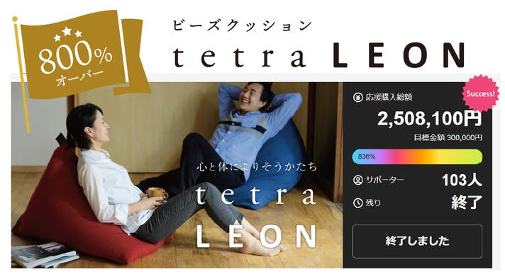 2020年、Makuakeプロジェクトでは、ビーズクッション「tetra LEON」プロジェクトを実施し、おかげさまで800%オーバーの応援購入をいただきました。