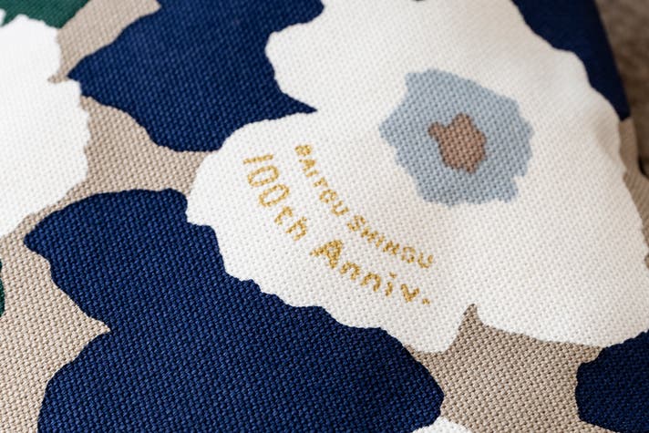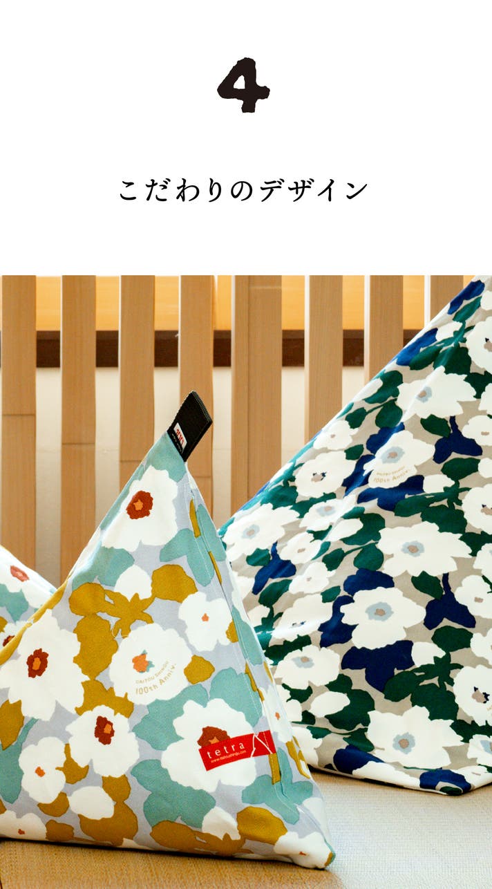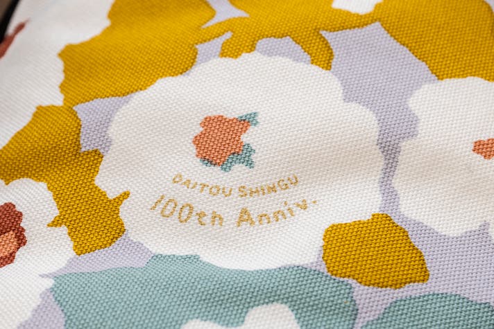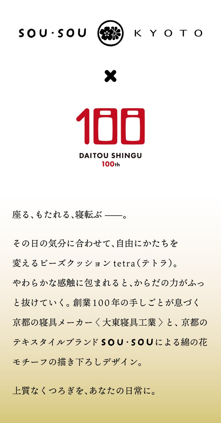 今回の「SOU・SOU × tetra」では、コラボレーションの証として、持ち手部分に大東寝具100周年とSOU・SOUのネームを配しています。またテキスタイルには100周年テキストが入っており、従来のtetraシリーズとは一線を画したデザインに仕上がっています。