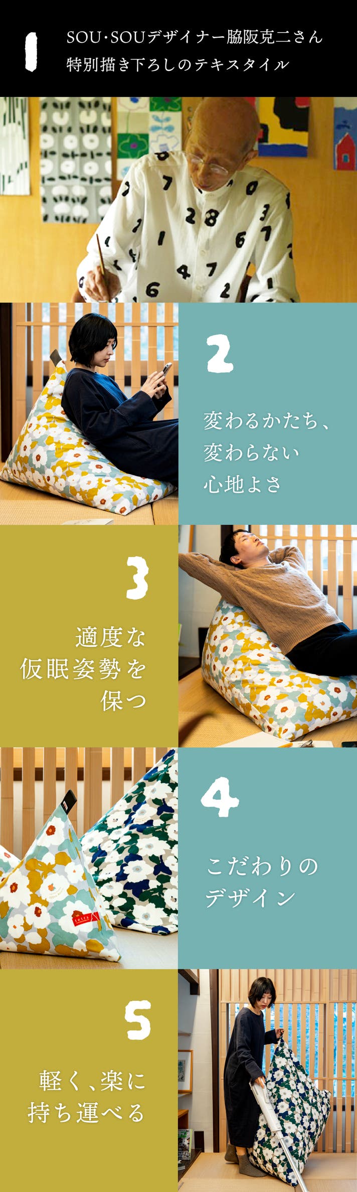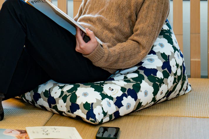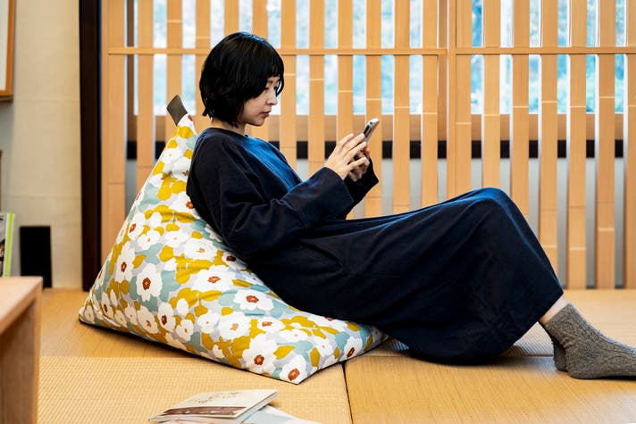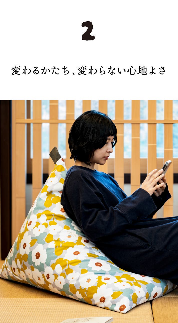 日本の暮らしに生まれた、新しいくつろぎの指定席。座ると自然に背もたれが立ち上がり、深く腰掛けてゆったり身を任せることができます。中材のビーズが体に寄り添うようにフィットし、体勢に合わせて形を変える不思議なビーズクッションです。