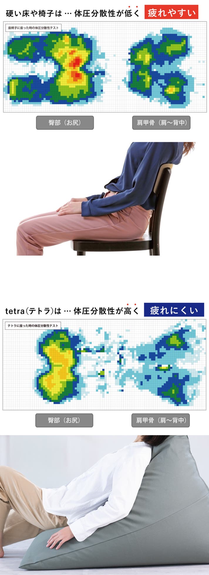 tetra(テトラ)は、背中からお尻までやわらかく受けとめ、体に沿ってなだらかにフィット。体圧を均一に分散することで、特定の部位に負担が集中しにくく、長時間でも心地よさが続きます。