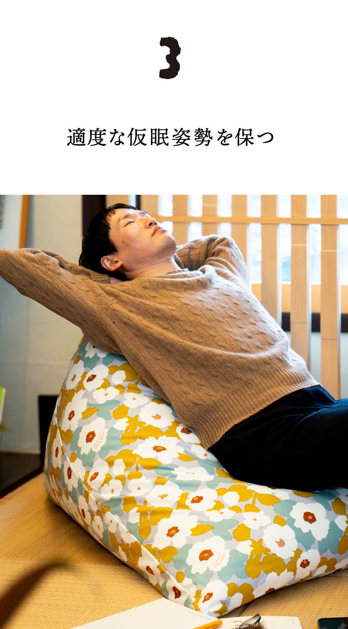そんな時に15〜30分ほど軽く体を休めると、気分がすっきりして、その後もより快適に過ごせます。 tetraは身体をやさしく支えてくれるので、横にならずにほどよい姿勢でくつろげるのが魅力。休日の「ちょっとひと息」にもおすすめです。