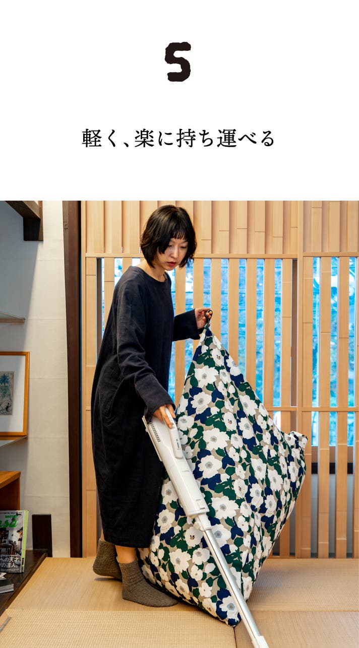 ビッグサイズでも重さは約3.6kg。女性でも片手で楽々運べる軽さが魅力。ソファと違って掃除も簡単です。リビングだけでなく寝室に持っていって就寝前のくつろぎのひと時にも是非tetraを活用してください。