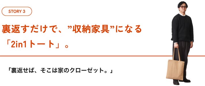 - 裏返すだけで“収納家具”になる。「2in1トート」