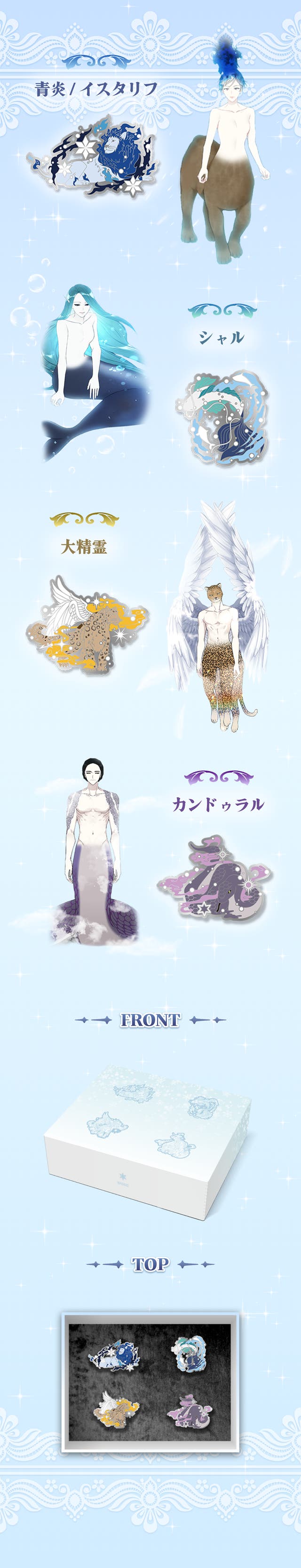 <緑陰の冠> 世界観の精霊たちをモチーフにしたプレミアムメタルバッジを企画しました。 ライオンの下半身を持ち、ラチア当主の指輪に封印されている 炎の精霊、青炎(イスタリフ)。 ドウォプ村の黒い山地下鉱泉水で出会った人魚の容姿をした精霊、シャル。 徹底した階級制からなる精霊界から上級精霊へ ヒョウの顔に天使の翼を持っている大精霊。 他の公爵家であるバラのウスラ、そこにある精霊で蛇の姿をしている 黒く光る槍、斬撃。