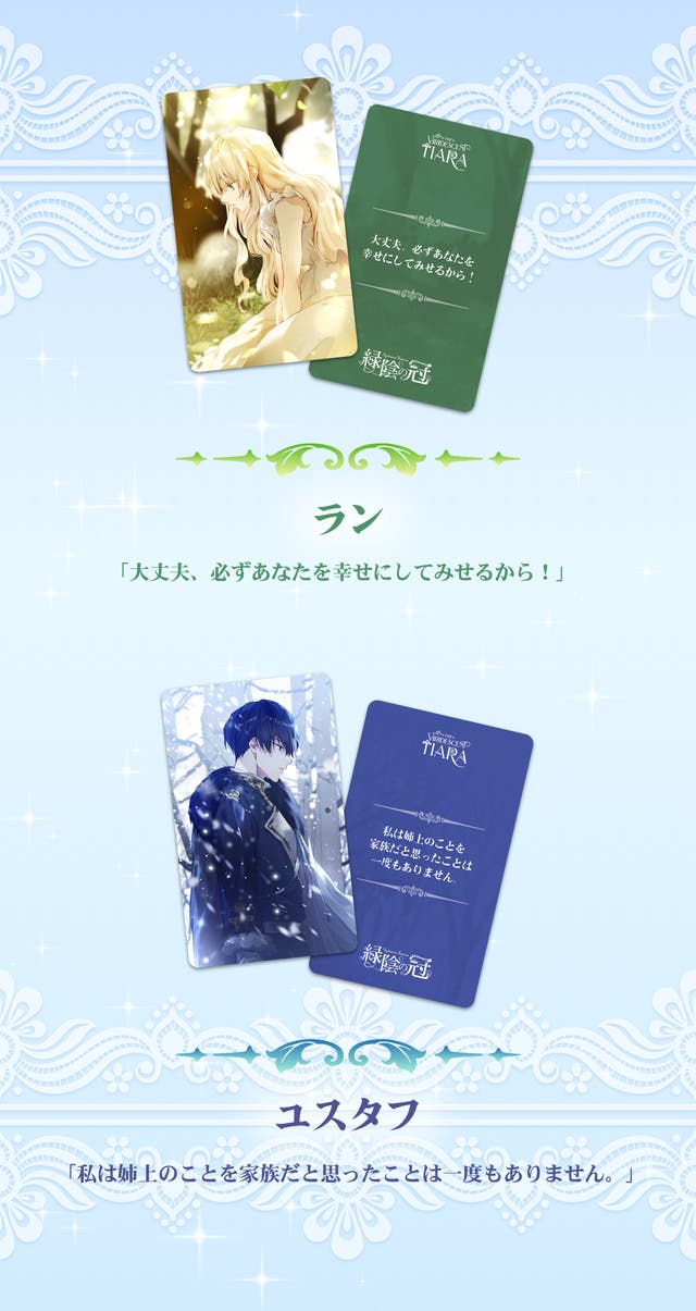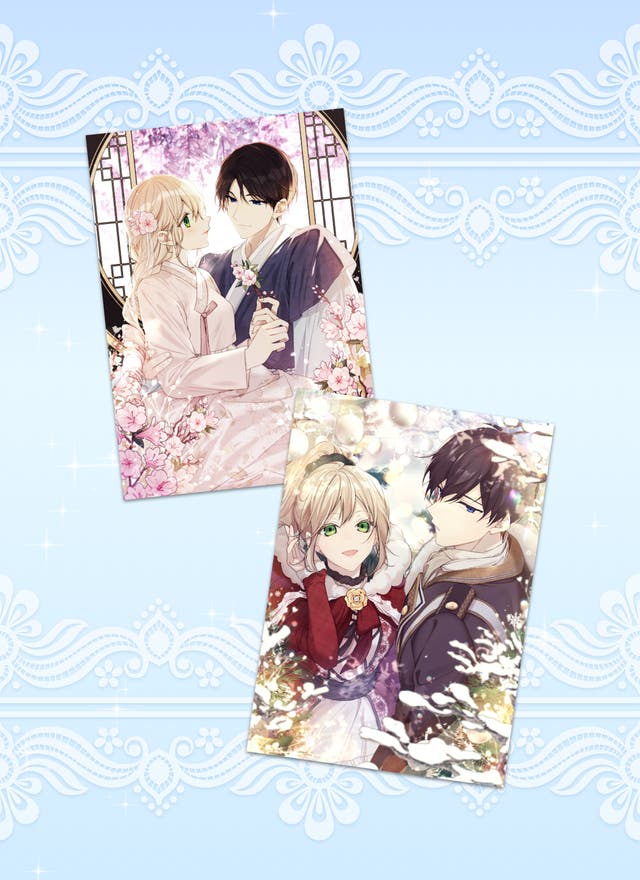 作者が今回の青炎ジュエリープロジェクトプロジェクトのために新たに書き下ろしたスペシャルイラストを活用したプレミアムポストカード2種です。 西洋風の世界観である緑陰の冠では、貴重な韓服を着たランとユスタフの姿が盛り込まれた東洋風イラストと ラチアの天気と冬にふさわしいイラストで、暖かい年末、クリスマスの雰囲気の中、ランとユスタフの姿が詰まったホリデーイラストです。