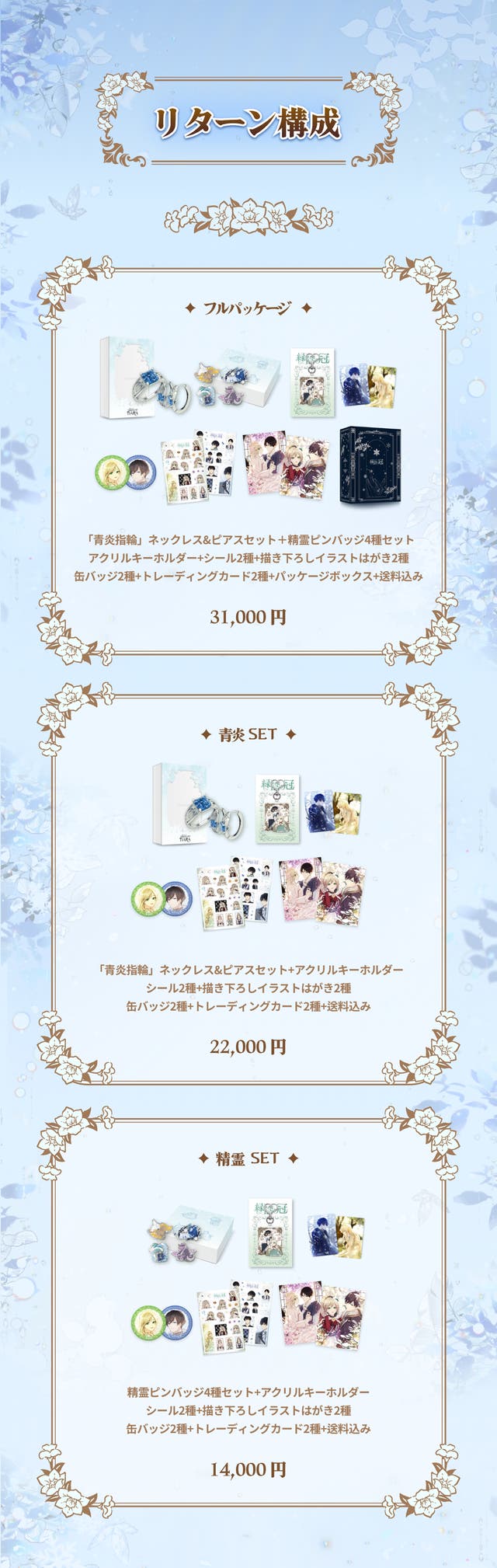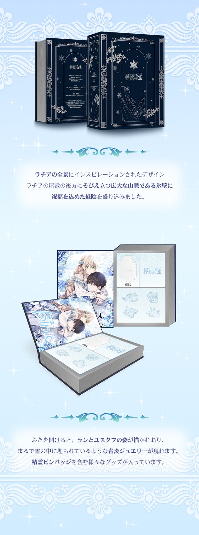 こんにちは。<緑陰の冠>読者の皆さん! ダオンクリエイティブです。 ラチアのシンボル! 青炎リングネックレス&イヤリングセット。 緑冠世界観の精霊をモチーフにした プレミアムメタルバッジ4種セット, 作者がこのプロジェクトのために特別に書き下ろした スペシャルイラストを使用したポストカードとアクリルキーリング, ランとユスタフの対照的な姿が際立つ フォトカードとステッカーシート, そしてグッズをより特別に受け取れる このプロジェクト限定緑陰の冠スペシャルパッケージ! よりハイクオリティなグッズを製作するPEPPERANDSALTと共に 青炎ジュエリー&スペシャルグッズプロジェクトをご用意しました。