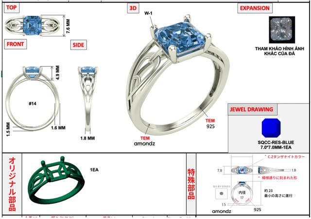 「ジュエリー製品は生産も非常に重要ですが、 その中でも特に重要な部分は企画とデザインです。 韓国の若い世代にとって最もホットなジュエリープラットフォーム「amondz」 企画/デザイン/生産までできるメーカーはそう多くありません。 デザイン企画の中で気を使った部分は2つでした。 1つ目は、どれだけ実写に近く製品化できるか。 2つ目は、使用可能か。実際に身に着けて使用できるのかという部分も重要な点でした。 指輪はペンダントとして活用できるようにデザインし、ストーンのカラーは何度も変更し一番近いものにしました。 指輪、ネックレスチェーン、イヤリング、全てシルバー925で製作されており、宝石はカラーからカッティング方式、サイズまで細かく企画・デザインしました。